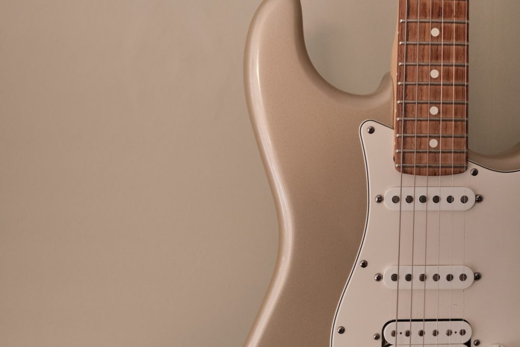 Close up of the body and neck of an electric guitar against a plain background.