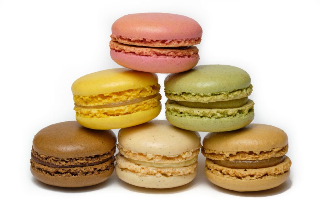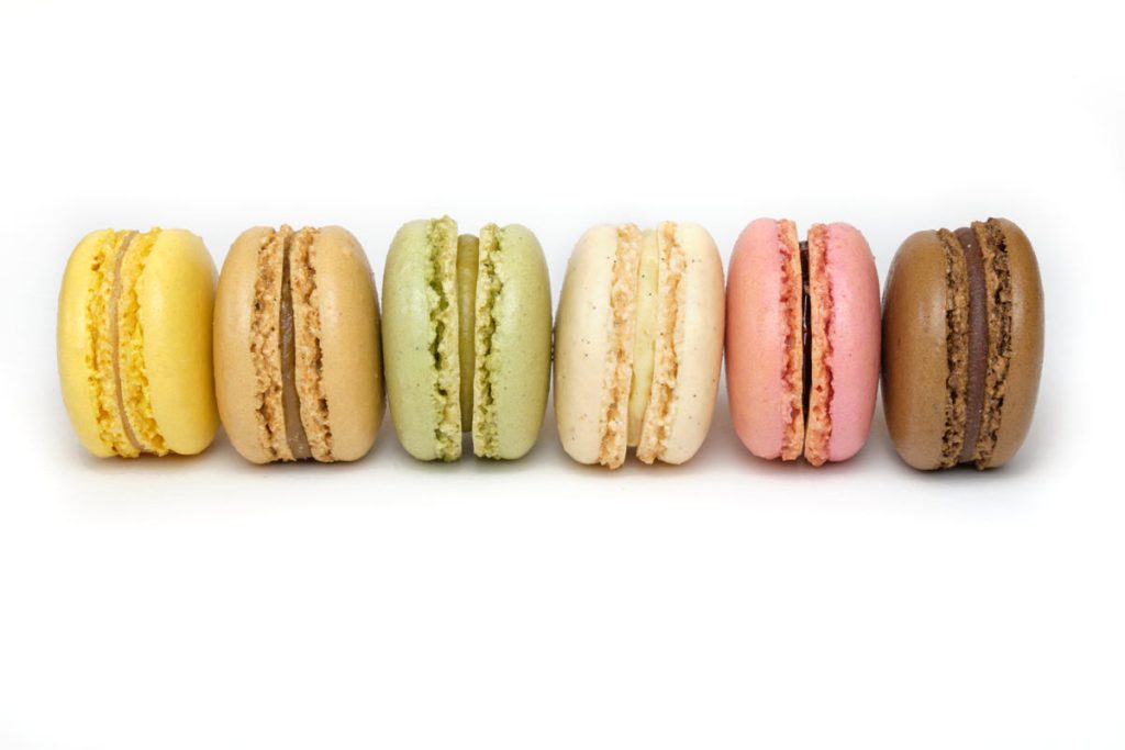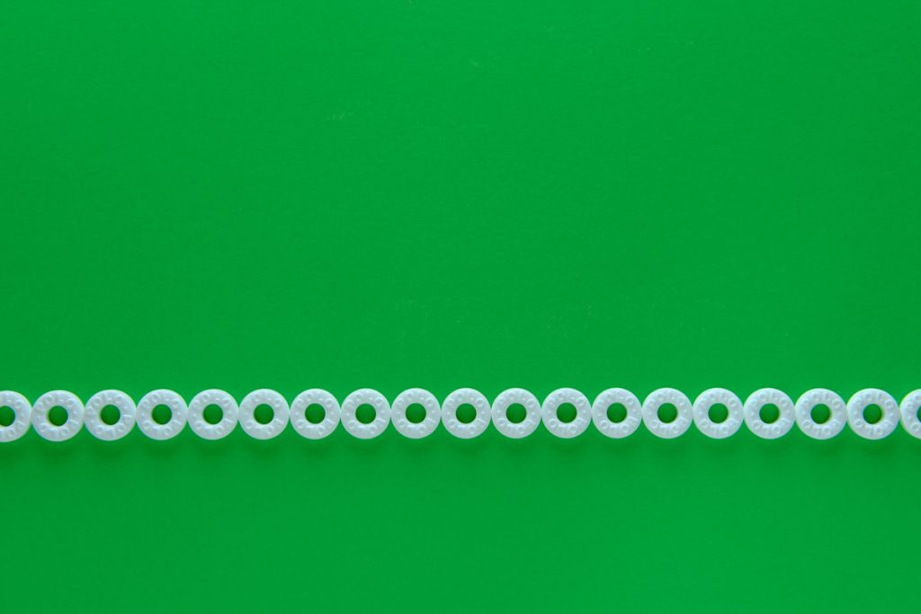 A row of Polo sweets against a plain green background. Top down view.