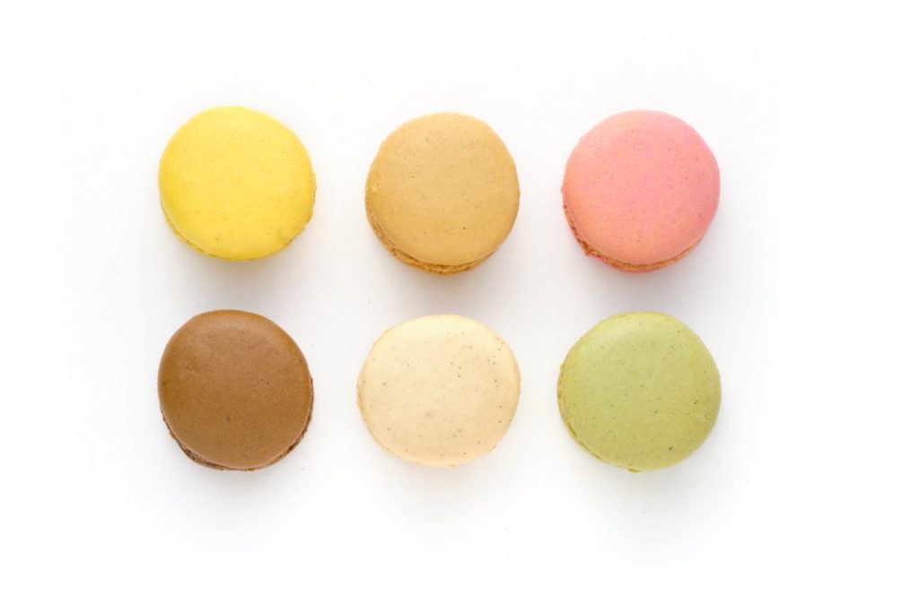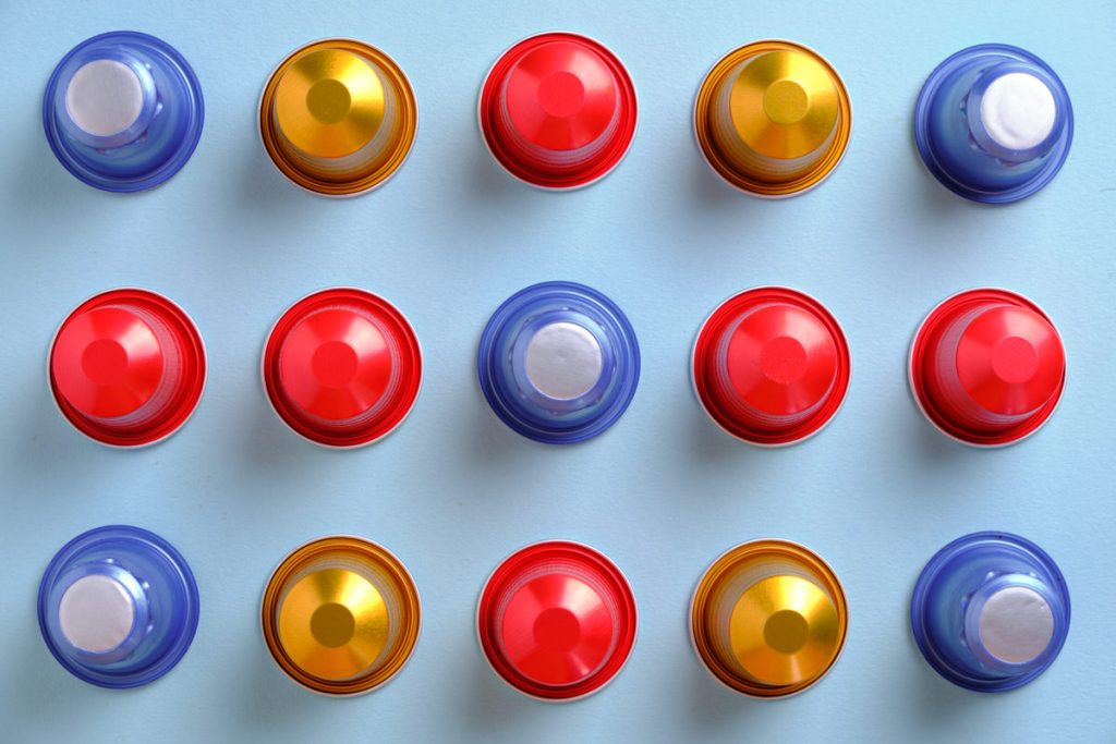 Multi-coloured coffee pods in a grid against a plain background. Top down view.