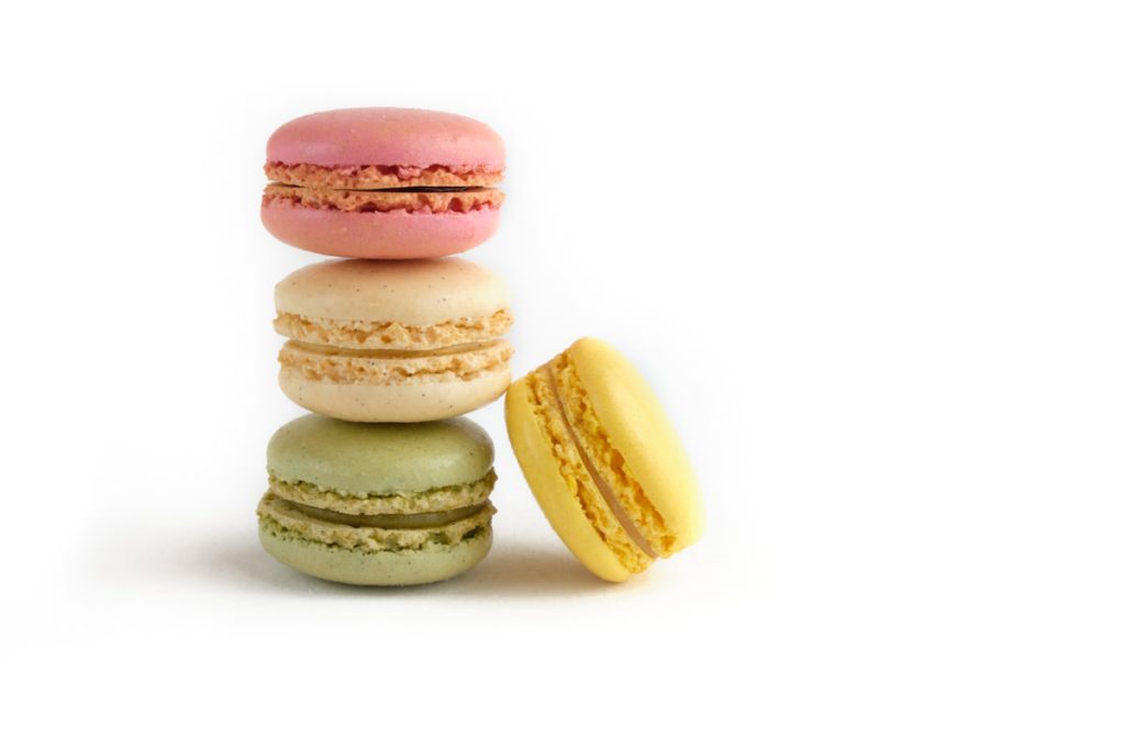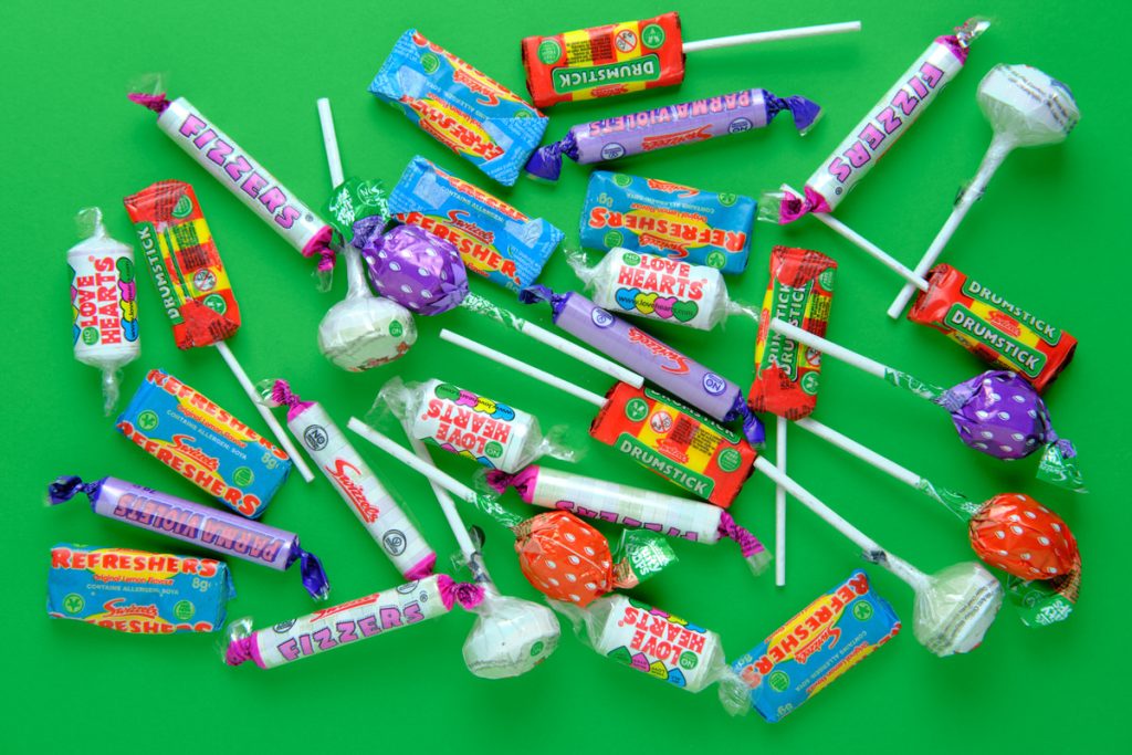 A pile of retro candy sweets against a plain green background. Top down view.