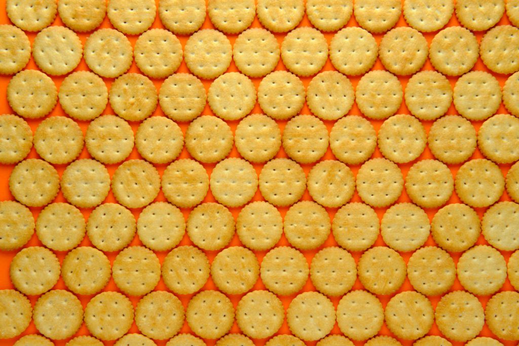 Crackers in repeating rows against a plain background. Top down view.
