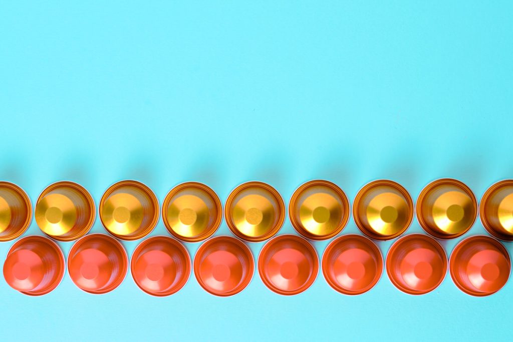 Gold and red coffee pods in a row against a plain background. Top down view.